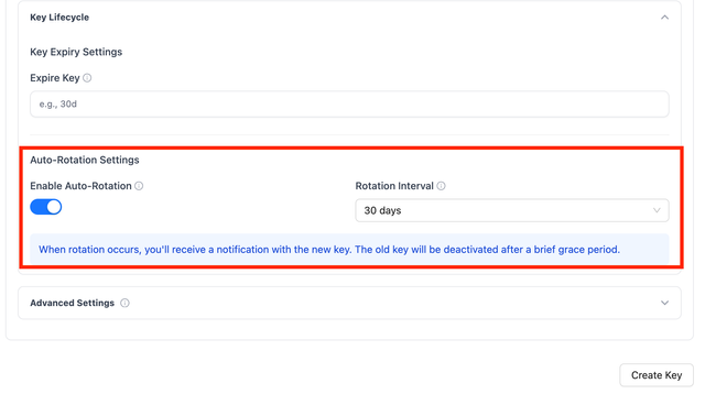 On the LiteLLM UI, Navigate to the Keys page and click on Generate Key > Key Lifecycle > Enable Auto Rotation